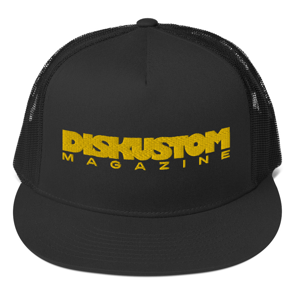 Snapback mesh hat, black with golden embroidered Diskustom Magazine logo.